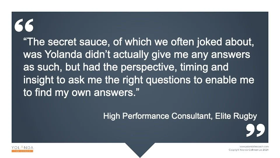 “My problem was me, setting the bar too high and repeating patterns of behaviour. My realisation came when I voiced what had happened and understanding why I was feeling the strain. The safe space with Yolanda allowed me to offload and actually talk and be listened to. Whilst friends and family try to fix and problem solve for me Yolanda’s coaching style was open, reflective, non-judgmental and challenging. I really valued it.